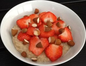 Havregryn, hyldeblomstsaft og vand koges ved svag varme i 1-2 minutter under jævnlig omrøring. Smag til med salt. Pynt med friske jordbær i skiver og groft hakkede mandler.