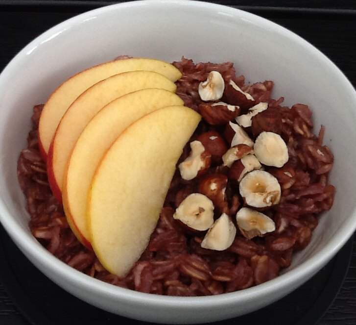 Havregryn, solbærsaft og salt koges ved svag varme i 4-5 minutter under jævnlig omrøring. Pynt med æble i tynde skiver eller tern og groft hakkede hasselnødder.