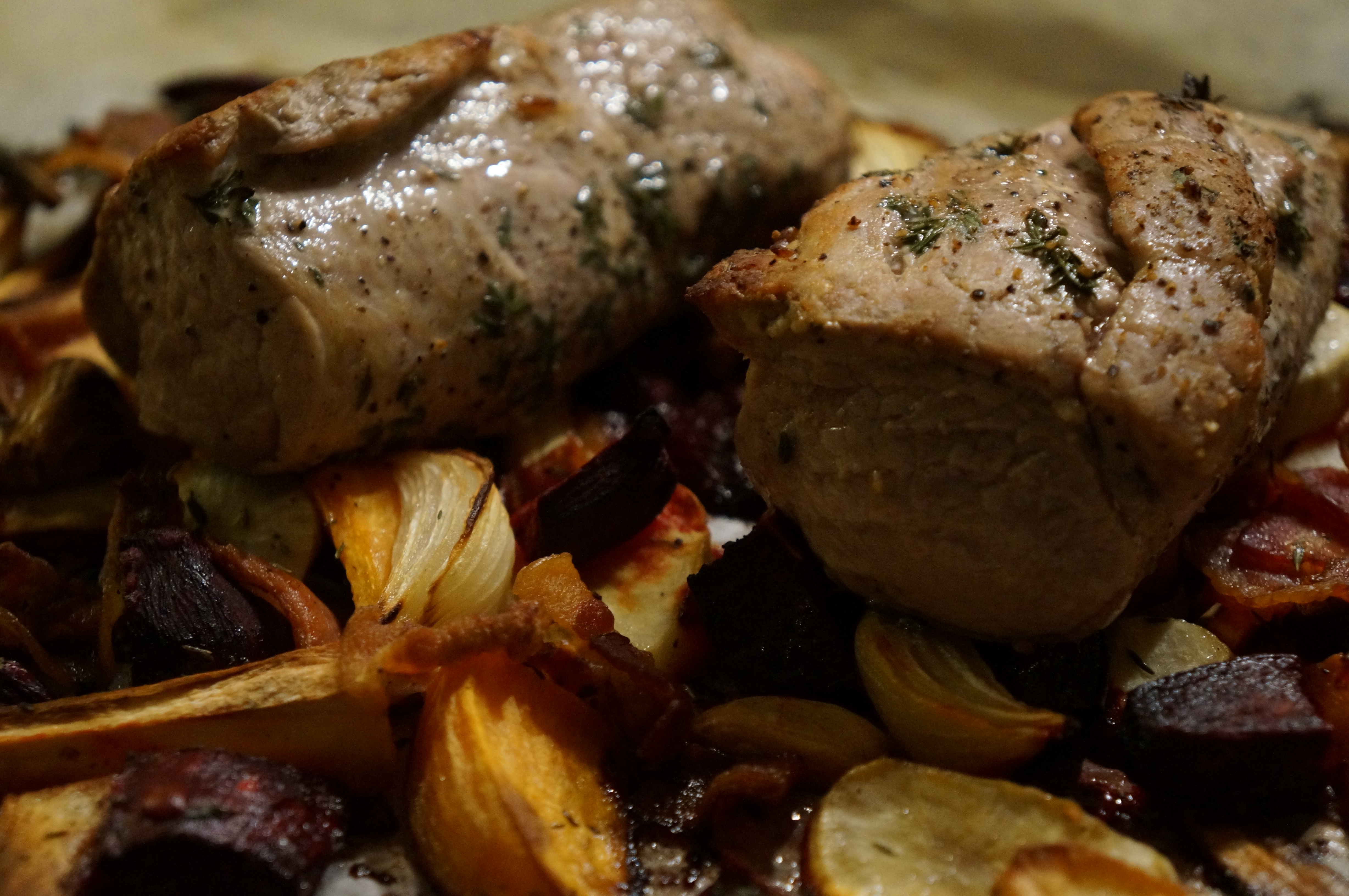 Imens pudses mørbraden af og deles i to. Skyl timian og hak det groft. Rul mørbradsstykkerne i timianen og krydr med salt og peber. Brun dem på en pande ca. 2 minutter på hver side, indtil de har en fået farve på alle siderne. Når rodfrugterne har fået de første 25 minutter lægges de to mørbradsstykker ind oven på rodfrugterne. Bag det hele i yderligere 15 minutter. Tag det hele ud og lad kødet hvile i 5 minutter og skær det derefter i skiver.