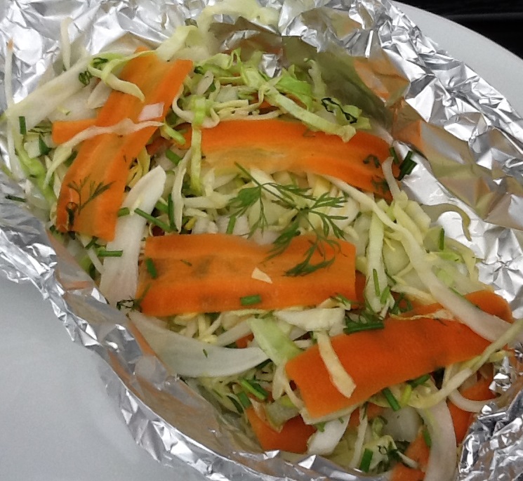 Rens grøntsagerne. Snit spidskål i fine strimler. Hak løg groft. Snit gulerødder og fennikel i lange papirtynde strimler – brug evt. en skrællekniv til at lave de lange strimler. Hak krydderurter efter eget valg fint. Rør marinaden sammen og bland den i grøntsagerne. Pak blandingen i alufolie med lukningen opad. Sæt pakkerne på grillen eller i en 200 grader varm ovn i 5-10 minutter. Drys evt. lidt krydderurter på grillsalaten inden servering.