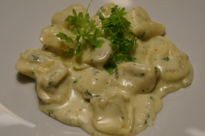 Løget pilles og hakkes fint. Smørret smeltes i en gryde og det hakkede løg svitses indtil det får farve. Melet drysses i, gyldnes under omrøring og spædes lidt efter lidt med den varme bouillion. Saucen bringes i kog under stadig omrøring. Vin og fløde tilsættes og der smages til med salt, hvid peber og muskatnød. Smelteosten tilsættes lidt efter lidt i den varme sauce.