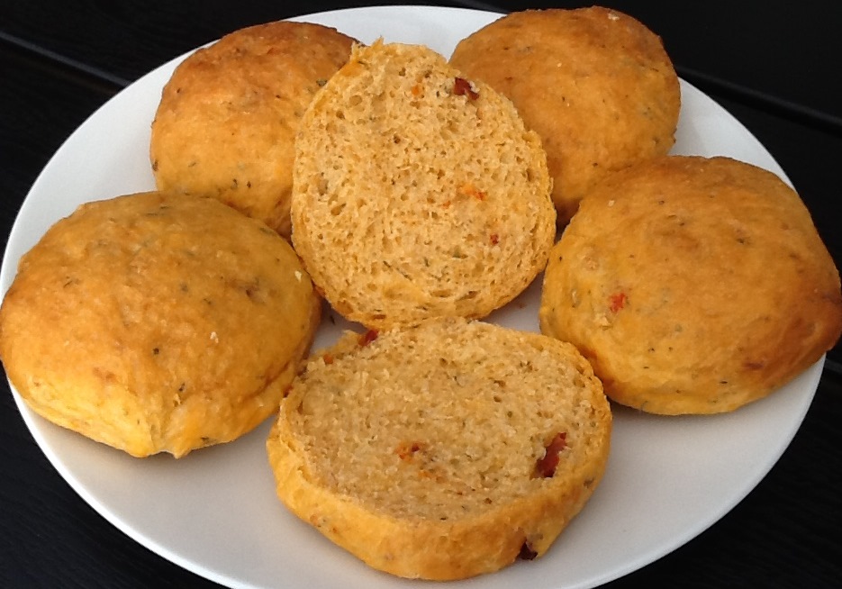 Margarinen smeltes og kommes i en skål sammen med vandet. Si væden fra en dåse flåede tomater (brug tomaterne i en sammenkogt ret eller frys dem ned til senere brug). Tilsæt tomatsaften og rør gæren ud heri. Yoghurt, salt, sukker, æg, havregryn og provencekrydderi tilsættes. De soltørrede tomater hakkes fint og røres i dejen sammen med melet. Dejen æltes godt igennem. Stilles til hævning et lunt sted ca. 20 min. Dejen slås ned og deles i 20 stykker, der formes til boller. Stilles på plade og efterhæver et lunt sted ca. 45 min. Pensles med flydende margarine tilsat presset hvidløg både før og efter bagningen. Bagetid: ca. 20 min. ved 200 grader. Spis bollerne med pålæg.
