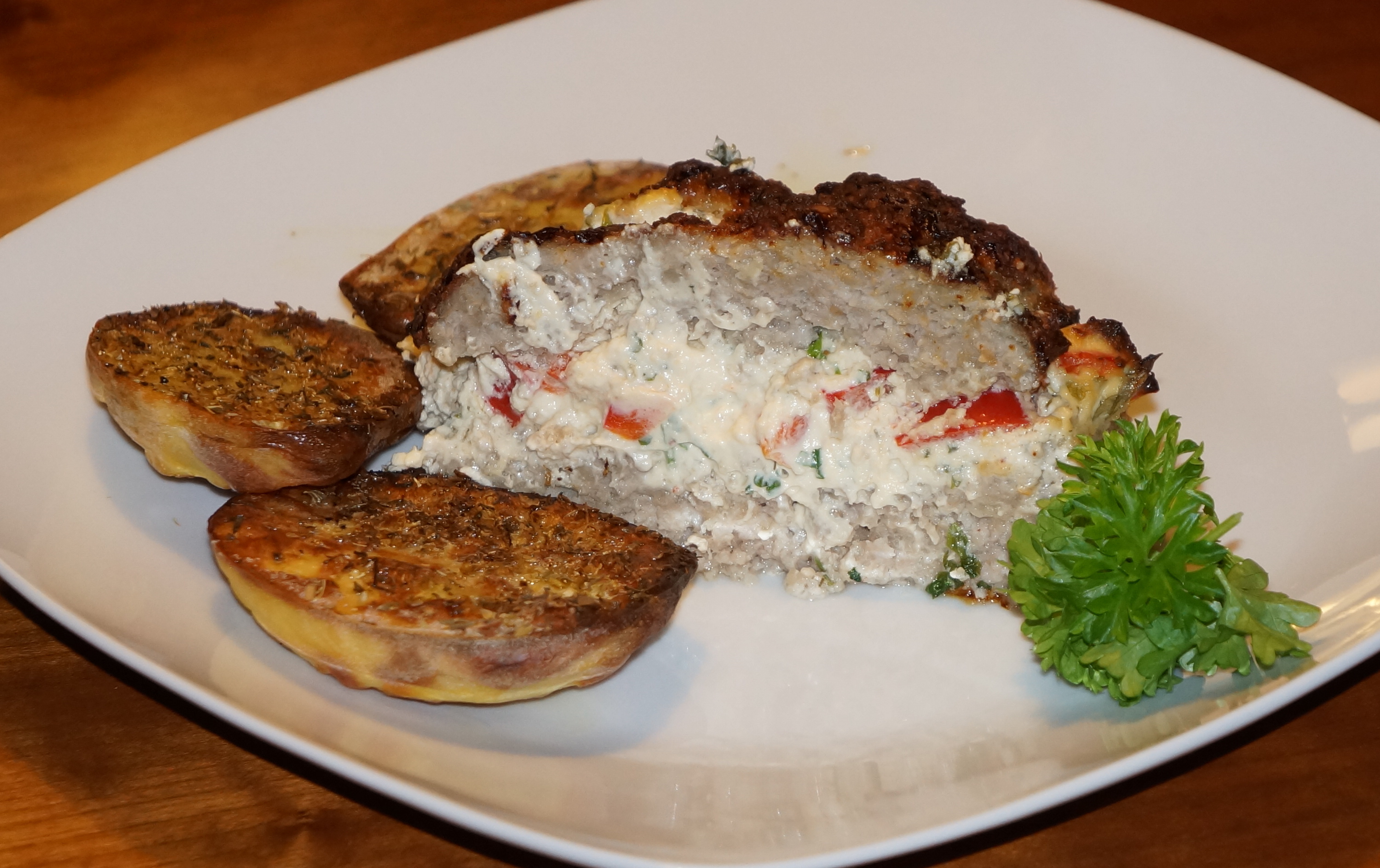 Kom fars og rasp i en skål. Riv løget heri. Tilsæt æg, salt og peber og rør farsen godt. Tilsæt lidt vand, hvis farsen er for fast. Skær peberfrugten i små tern og snit purløg eller persille. Rør pikantosten med peberfrugttern og purløg eller persille. Læg halvdelen af farsen i et ildfast fad, smør pikantostblandingen på og kom resten af farsen ovenpå. Form det til et farsbrød og bag det i ovnen i 200 grader i ca. 1 time.