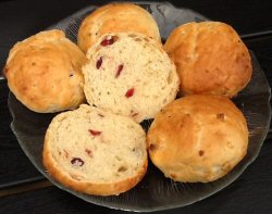Smelt margarinen i en gryde. Hak chokolade og tranebær - ikke alt for fint. Smuldr gæren i en skål. Hæld tykmælken i den smeltede margarine og hæld blandingen over gæren. Rør gæren ud i blandingen og tilsæt salt, sukker, æg og det halve af melet. Tilsæt chokolade og tranebær og rør dejen godt. Ælt resten af melet ind i dejen, lidt ad gangen. Lad dejen hæve tildækket og lunt i en times tid. Når den er hævet, æltes dejen igennem, og formes til boller. Lad bollerne hæve en halv time. Derefter pensles de med mælk og bages ca. 15 minutter ved 200 grader.