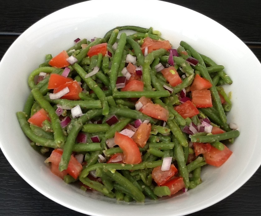 Nip bønnerne og kog dem i letsaltet vand i 5 minutter. Dressingen piskes sammen af sennep, balsamico, olie, salt og peber. Løget skæres i fine tern. Tomaterne (kun det udvendige) skæres også i fine stykker. Hæld vandet fra bønnerne og kom dem ned i dressingen.Tilsæt tomat og løg til salaten. Lad salaten afkøle helt eller server den lun.