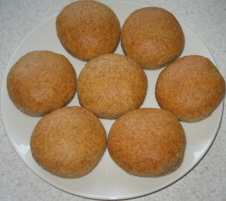 Hæver til dobbelt størrelse. Formes til boller, som stilles på plade og trykkes flade.