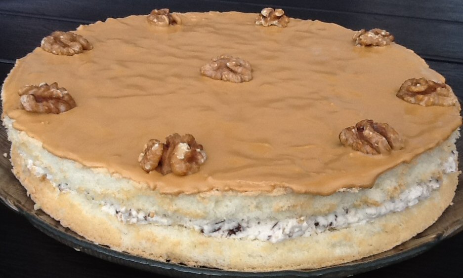 Kom vanillesukkeret i piskefløden og pisk det til flødeskum. Hak valnødder og chokolade og vend dem i flødeskummet. Læg flødeskumsfyldet på en lagkagebund og bred det ud. Læg den anden lagkagebund oven på.