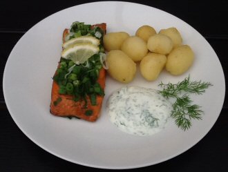 Læg laksen på fire store stykker bage- eller pergamentpapir. Pres citronsaft over. Hak forårsløg og dild og fordel det ovenpå laksen. Luk pakkerne og sæt dem i en 200 grader varm ovn i 10 minutter. Laksen serveres med nye kartofler og creme fraiche rørt med salt, peber, citronsaft og hakket dild.
