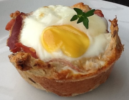 Varm ovnen op på 175 grader varmluft. Rul brødskiven flad med en kagerulle. Skær evt. skorpen af. Tryk brødskiven ned i en smurt muffinform, så den danner en lille skål. Rør flødeosten med sennep og smør det på indersiden af brødskålen. Hak osten lidt og kom den i bunden af skålen. Derefter en skive skinke, drys med lidt timian og slå til sidst et æg ud i et glas og hæld over i skålen. Bages i ovnen i ca. 15 minutter eller til æggehviden er stivnet.