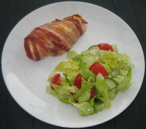 Skær et snit på langs i hver kyllingfilet. Smør Pikant flødeost i revnen. Drys med salt og peber. Tre skiver bacon vikles om hver kyllingfilet. Lægges i et ovnfast fad og steges i ovnen ved 200 grader i ca. 45 min. indtil baconen er gylden.