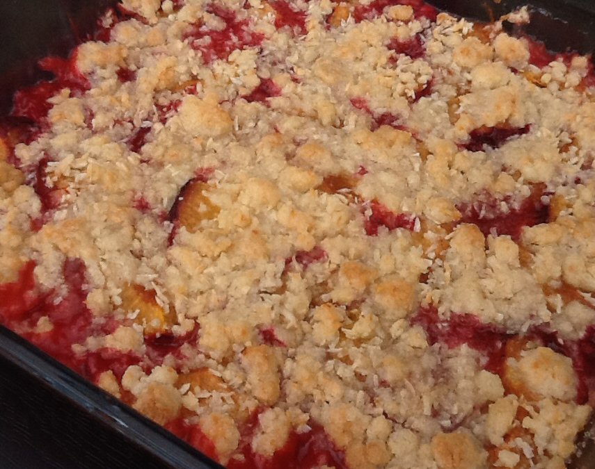 Bland kokosmel, sukker og mel og smuldr smørret heri. Smør en tærteform eller 4 portionsforme med smør og drys med sukker. Skyl blommerne, fjern stenen og skær dem i kvarte. Fordel kokoscrumblen over blommerne. Bag kagen i ovnen ved 200 grader i 25 minutter til den er gylden. Server crumblen lun med is, cremefraiche eller flødeskum.