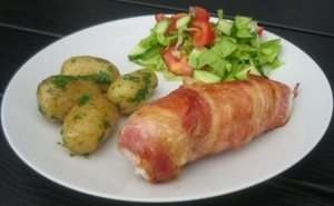 To skiver bacon vikles omkring hver kyllingfilet, som krydres med salt og peber. Steges på panden i lidt margarine.