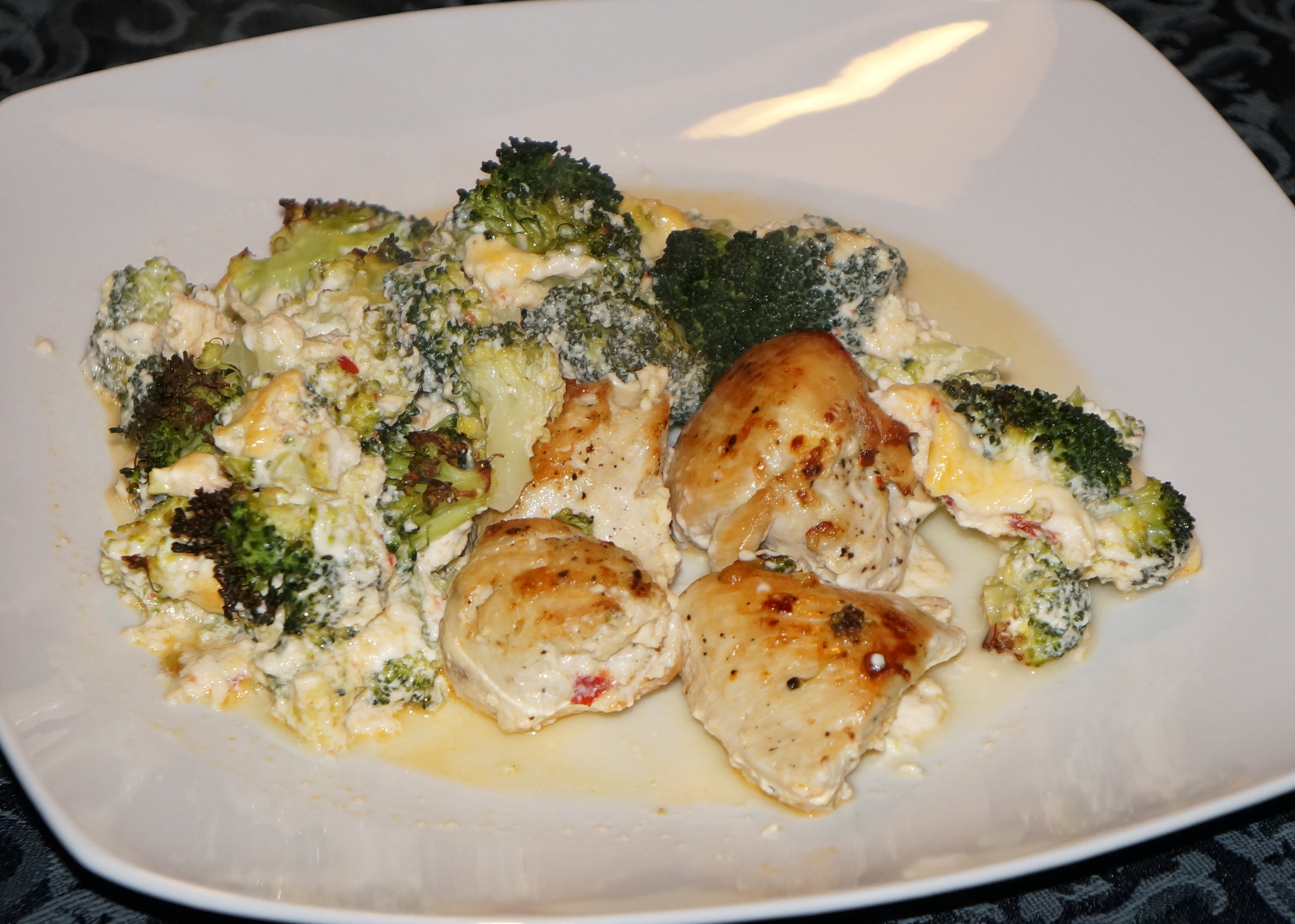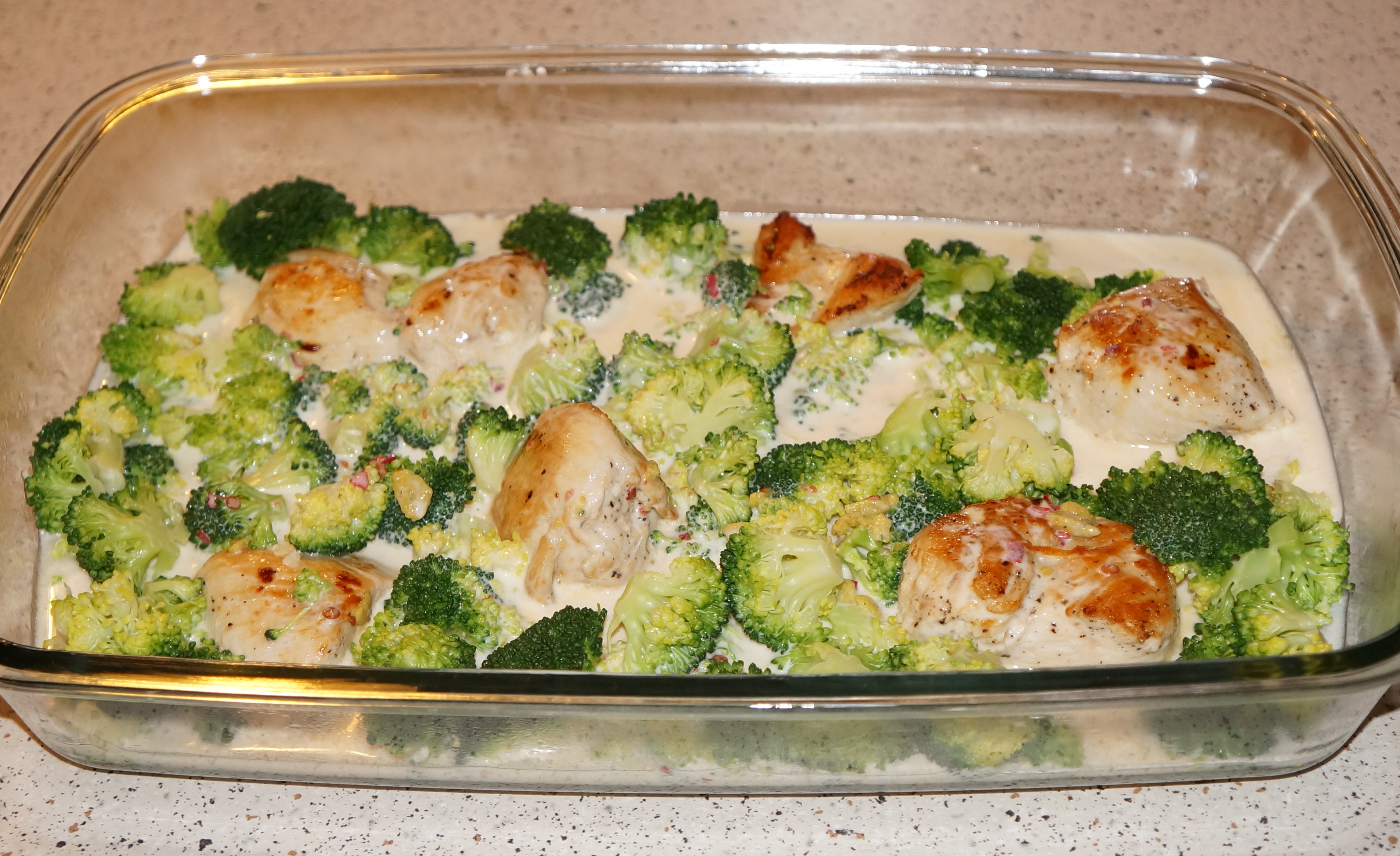Tænd ovnen på 200 grader. Skær hver kyllingebrystfilet i tre stykker på langs. Steg dem på en pande i fedtstof til de er gyldne på begge sider. Del broccolien i buketter og kog dem i letsaltet vand i 2-3 minutter. Æg, piskefløde og creme fraiche piskes sammen. Tilsæt sambal oelek, smuldret hønsebouillonterning og salt. Hæld vandet fra broccolien og læg den i et ildfast fad. Fordel kyllingestykkerne ovenpå. Hæld flødeblandingen over. Bag retten i ovnen i ca. 20 minutter til overfladen er gylden. Server retten som den er eller evt. med pasta.
