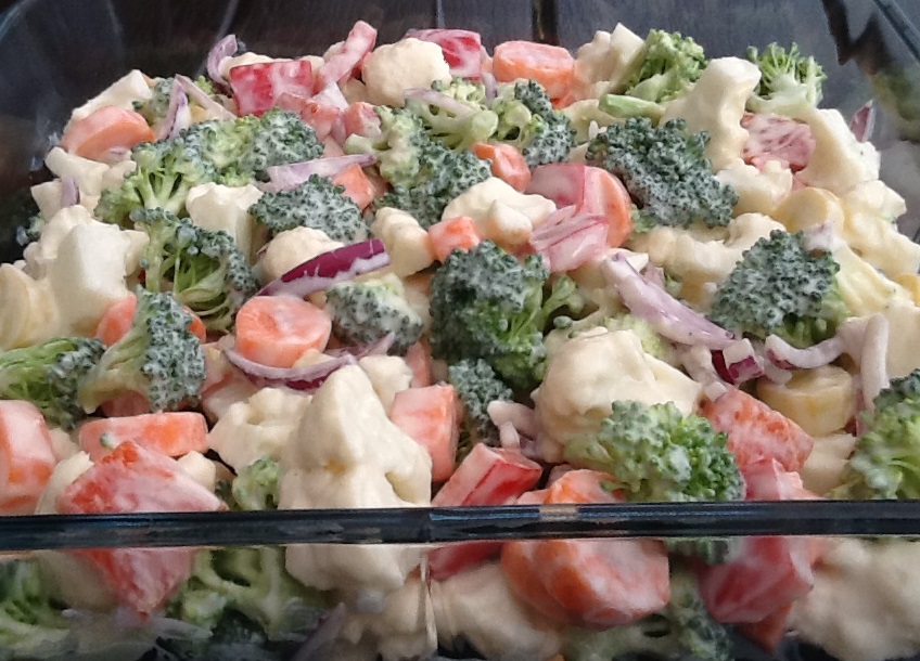 Blomkål og broccoli skæres i buketter. Gulerødder skæres i tykke skiver. Peberfrugt skæres i store tern og rødløg i tynde strimler. Smag creme fraichen til med sennep. Tilsæt presset hvidløg, salt og peber. Vend de snittede grønsager i dressingen.