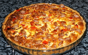 Beklæd en tærteform med tærtedejen og hæld pølseblandingen i formen.