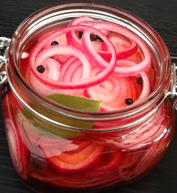 Skær løgene i tynde skiver og læg dem i et rent skoldet glas. Eddike og sukker koges op i en gryde sammen med peberkorn og laurbærblade. Hæld eddikeblandingen over løgene. Luk glasset og opbevar det køligt.