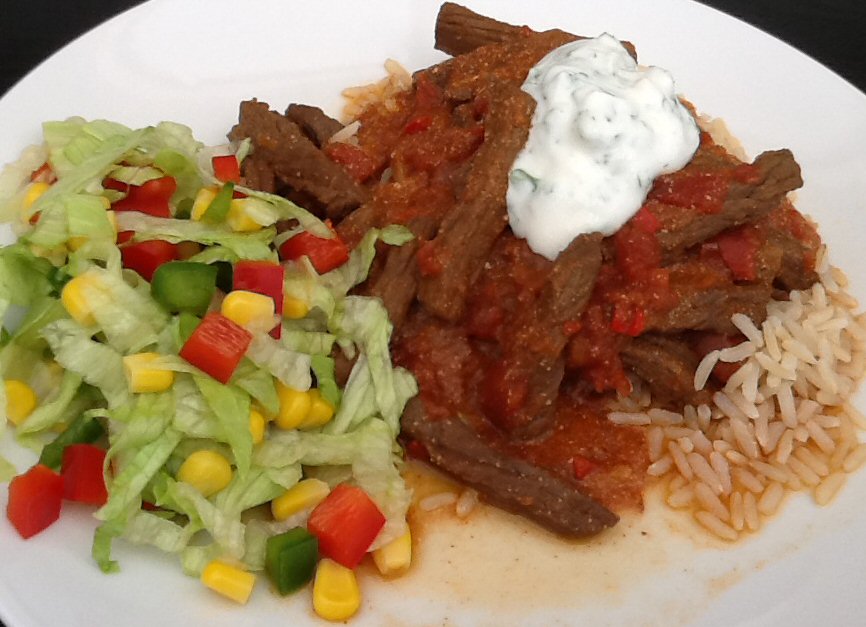 Tilbehør: Ris og salat (f.eks. Iceberg, majs, rød og grøn peberfrugt)