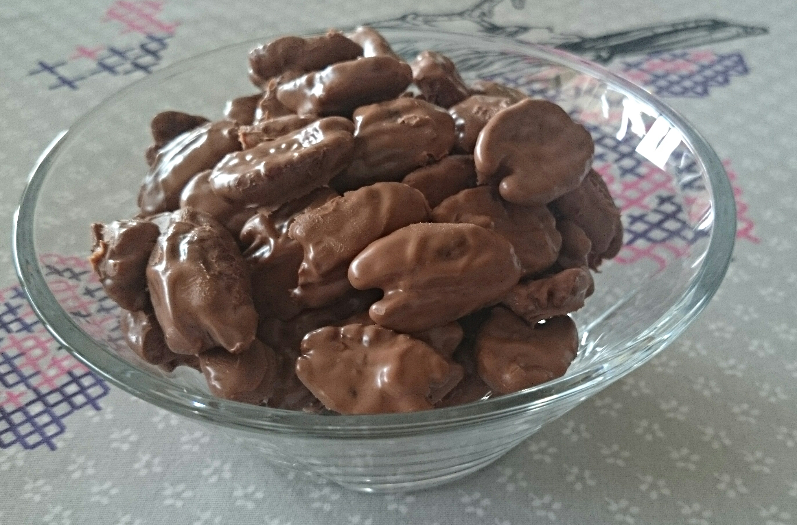 Smelt chokoladen i en skål i mikroovnen. Kom de afkølede nødder i skålen og rør godt rundt så de alle er dækket af et lag chokolade. Tag pekannødderne op en efter en med en teske og læg dem på noget bagepapir. Lad dem ikke ligge op af hinanden, da de vil størkne sammen. Vent til chokoladen er helt størknet.