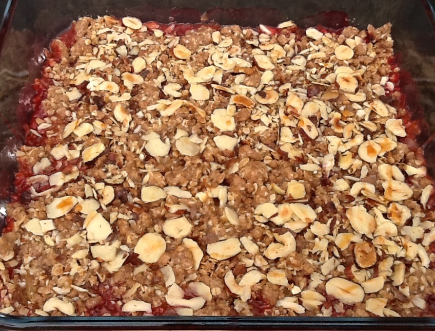 Bland mel, havregryn, rørsukker og kanel og smuldr margarinen heri. Dejen skal være grynet. Dejen lægges over blommerne. Drys med hasselnøddeflager og dryp med ahornsirup. Bages i ovnen ved 200 grader i ca. 15 minutter til overfladen er gylden. Serveres lun med iskoldt flødeskum