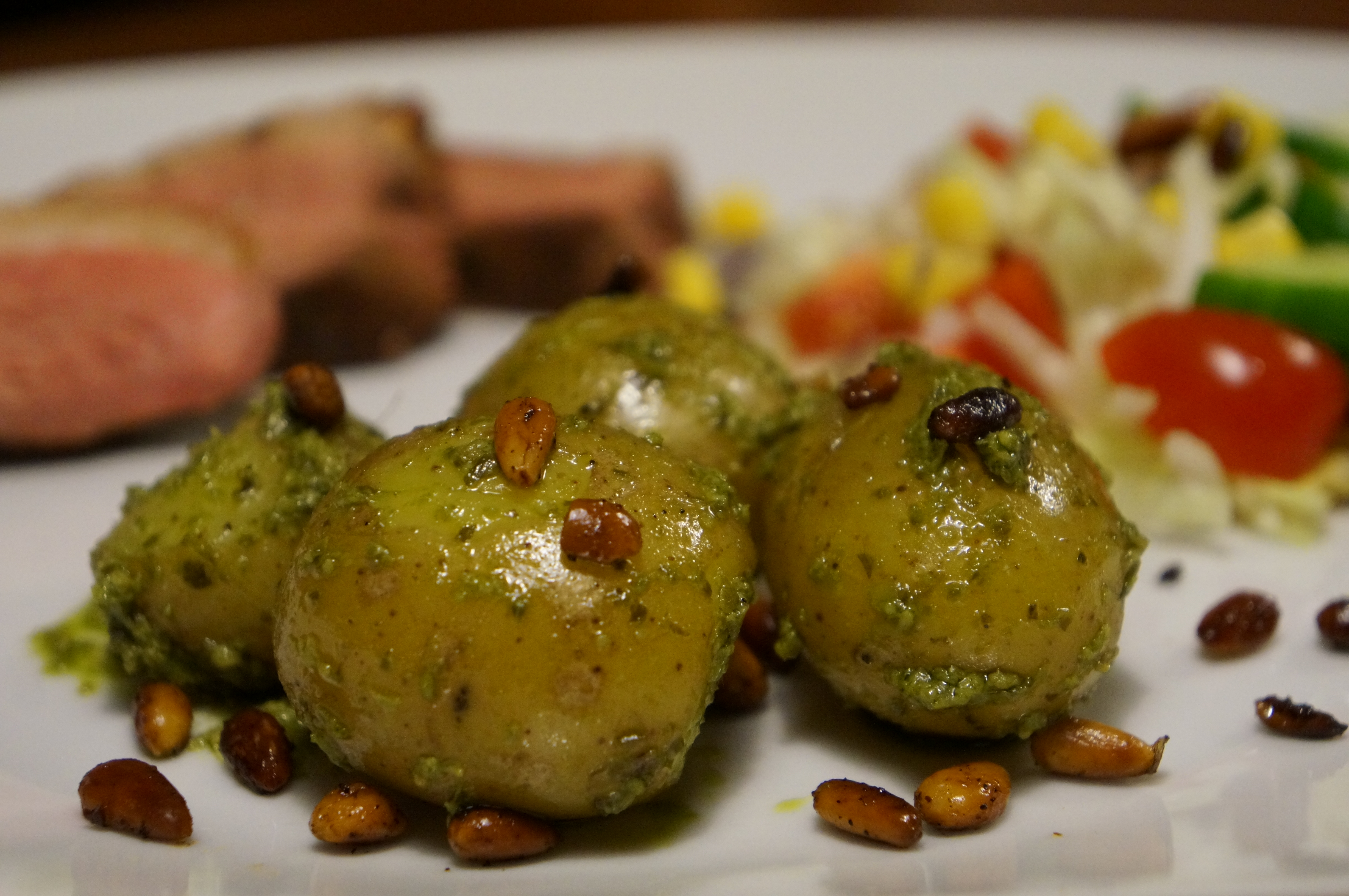 Tag kartoflerne op af vandet og læg dem i en stor skål. Lad dem køle af til rumtemperatur. Vend pestoen forsigtigt i kartoflerne således alle kartoflerne er dækket af pesto.