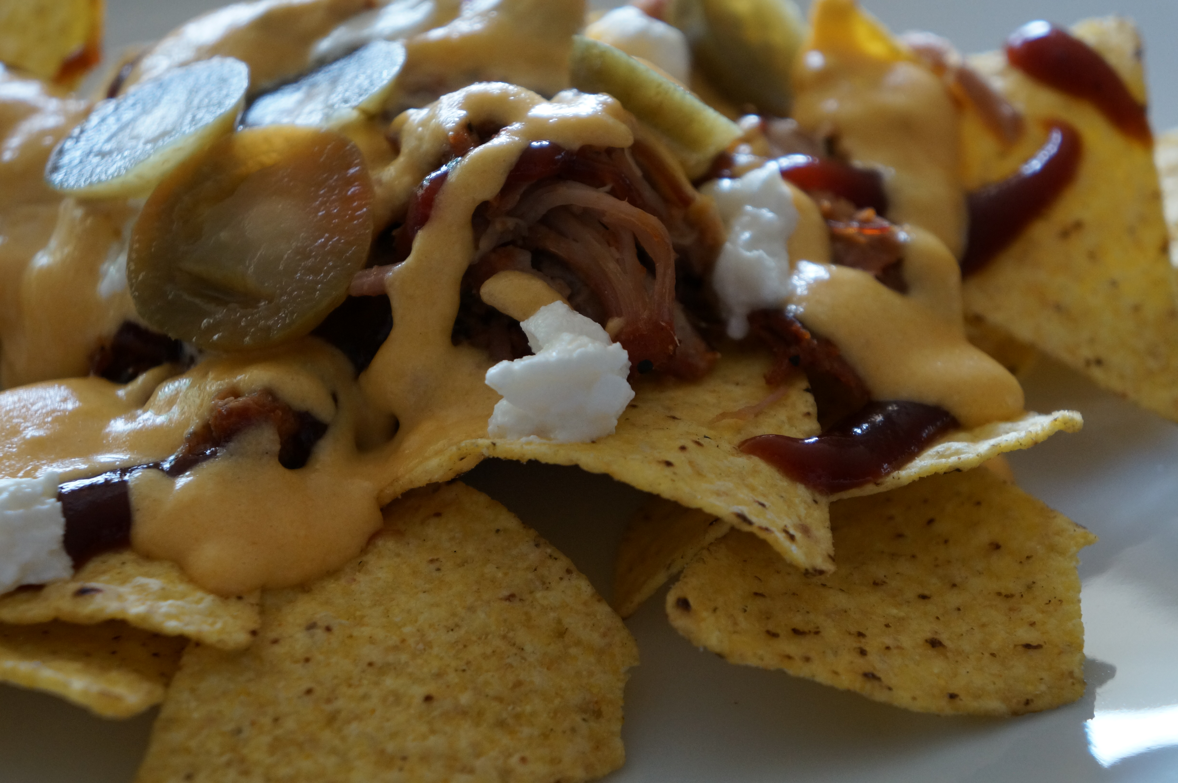 Start med at lave pulled pork og cheddar sovsen. På et serveringsfad spredes nachos chipsene ud i et godt lag. Fordel den varme pulled pork over chipsene. Hæl barbeque sovsen henover i et tynd lag. Fordel herefter cheddar sovsen over fadet. Pynt med syltede jalapenos skiver og queso fresco ost.
