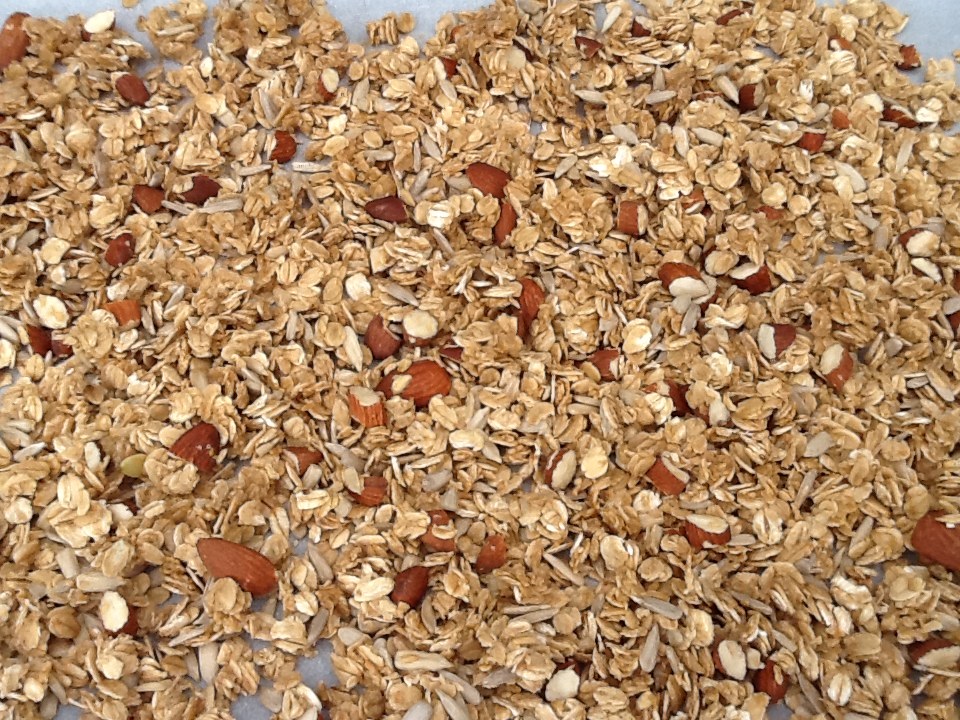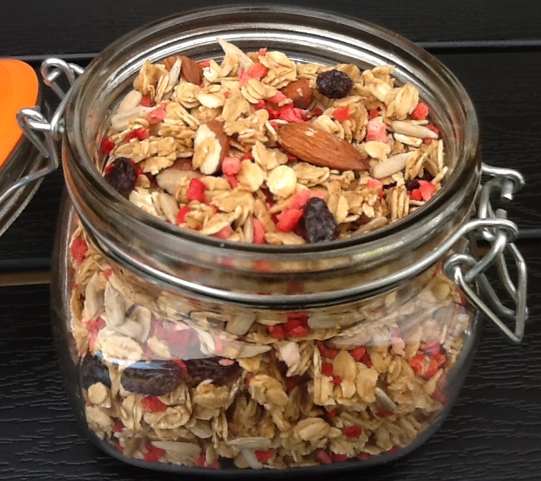Bland havregryn, hakkede mandler og solsikkekerner i en stor skål. Opvarm sirup og vand i en lille gryde til det netop smelter sammen. Hæld den lune sirupslage ud over blandingen og rør det godt sammen. Opvarm ovnen til 120 grader. Fordel blandingen jævnt ud på en bageplade beklædt med bagepapir. Bag myslien i 25 minutter og lad den efterfølgende afkøle helt ved stuetemperatur. Tilsæt rosiner og frysetørrede jordbær. Opbevar myslien i en tætsluttende beholder. Nyd den ovenpå ymer, skyr eller lignende.
