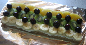 Når kagebunden er afkølet, pyntes den med en blanding af flødeskum og creme fraiche smagt til med vanillesukker. Herpå lægges frisk frugt.