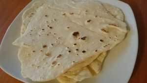 Lige før servering rulles kuglerne ud til en flad cirkel på ca. 24 cm. i diameter. Kom dem en efter en på en varm pande i ca. 30-45 sekunder på hver side.