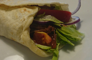 På hver durumrulle kommes der en passene mængde pulled beef og grøntsager i midten. Hæl lidt hvidløgsdressing over. Rul brødet sammen om indholdet og server.