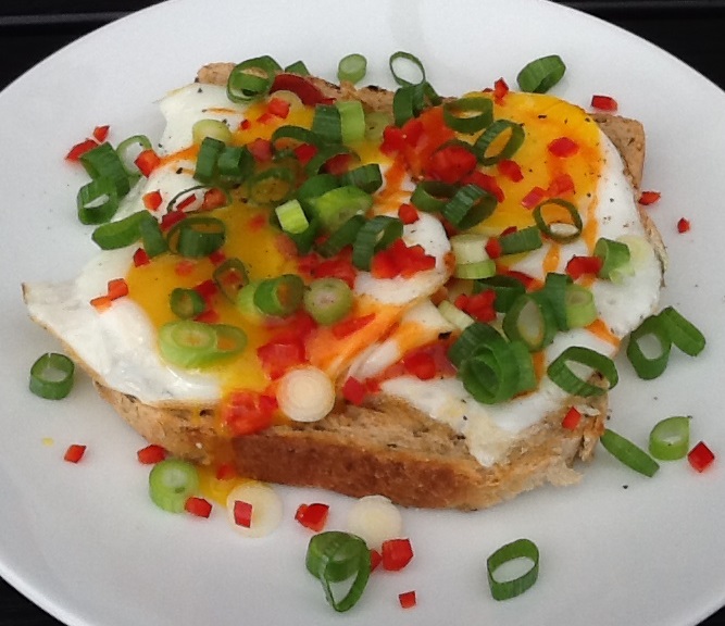 Rist toastbrødet. Steg æggene i lidt olie på panden. Snit forårsløg i tynde skiver og hak chilien. Læg toastbrødet på en tallerken og kom spejlæggene oven på. Kør tynde striber af chilisovs over æggene. Drys med forårsløg og chili. Kom salt og friskkværnet peber på. Stik gerne hul på æggeblommerne, så de løber lidt ud.
