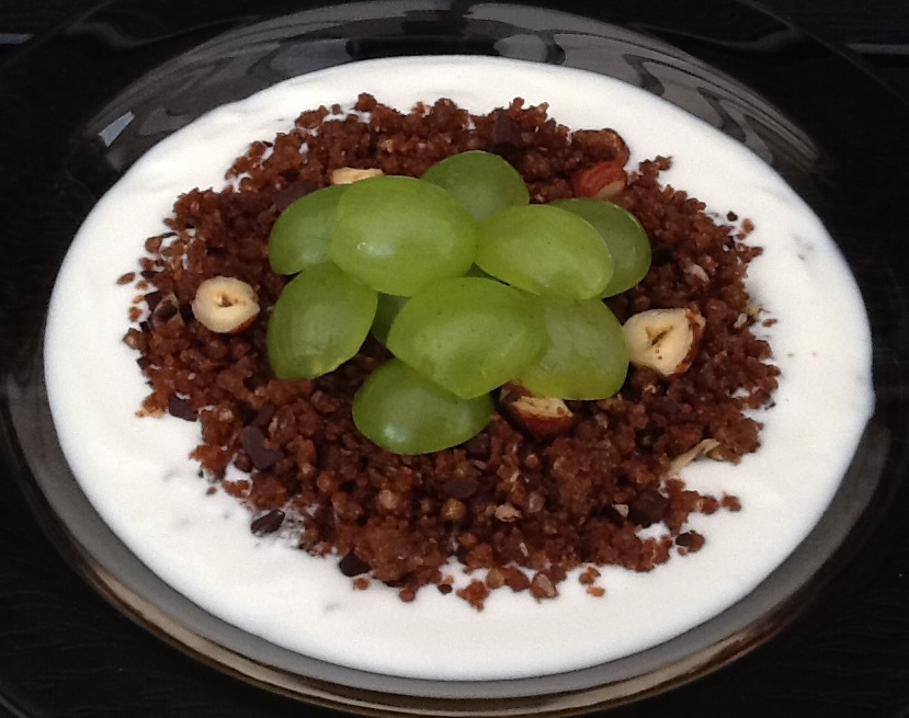 Hæld A38 i en dyb tallerken, kom ymerdrys med nødder og chokolade på og pynt med halve udstenede vindruer.