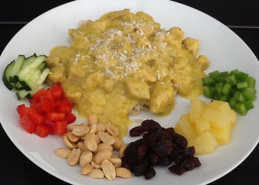 Tilbehør: Løse ris og små skåle med f.eks. rosiner, kokosmel, ananastern, rød og grøn peberfrugt i tern, peanuts og agurk i tern.