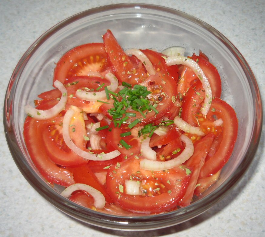 Skær tomater i både og løg i halve skiver. Kom det i en skål. Tilsæt olivenolie og balsamico eddike.