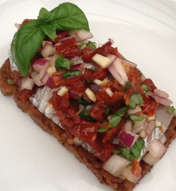Skær sildefileter i mundrette stykker og anret dem på et fad. Skær soltørrede tomater, hvidløg og rødløg i små tern. Snit basilikum. Bland soltørrede tomater, hvidløg, rødløg og basilikum og fordel blandingen på sildene. Krydr med friskkværnet peber.