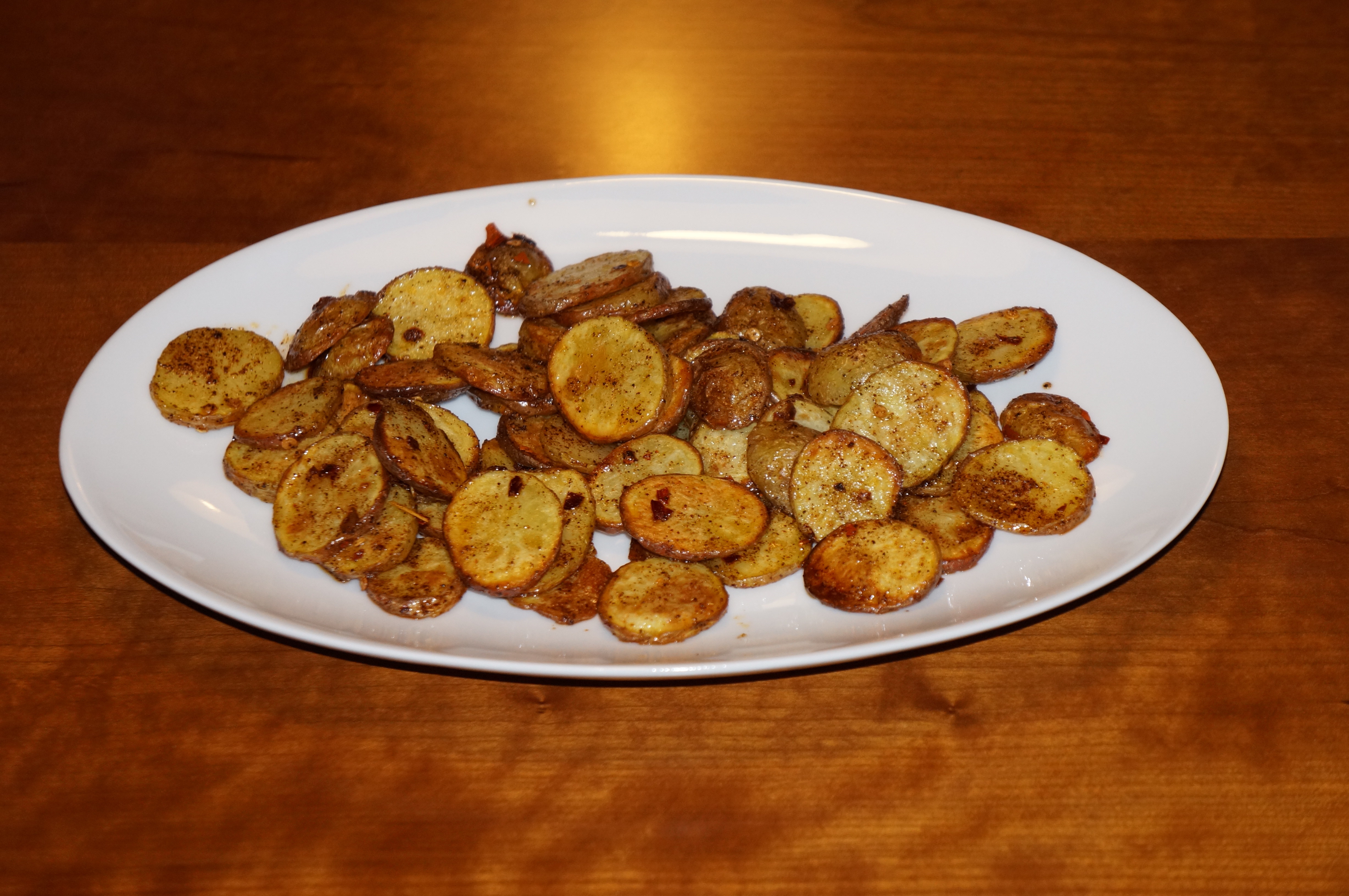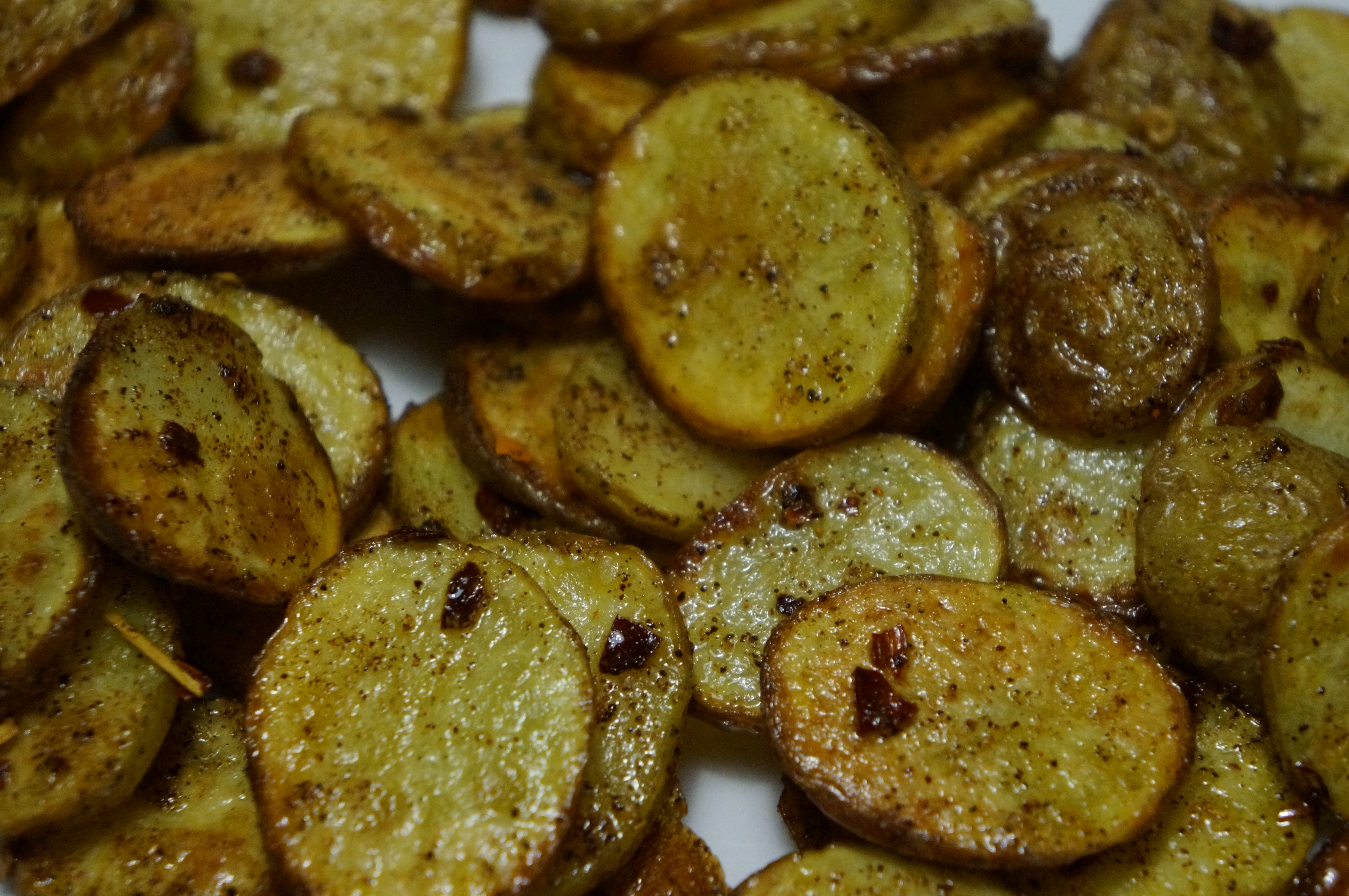 Vask kartoflerne og skær dem i tykke skiver. Kom solsikkeolien i en skål og vend kartoffelskiverne heri. Fordel kartoffelskiverne på en bradepande med bagepapir og kom dem i en forvarmet ovn på 200 grader. Bag dem i 20 minutter. Imens kartoflerne bages blandes solsikkeolie, salt, chilipulver og chiliflager i samme skål som tidligere. Rør det godt rundt til det er en ensartet marinade. Når kartoflerne er færdige, tages de ud af ovnen og kommes direkte over i skålen med marinaden. Fordel marinaden godt på kartoflerne ved at røre rundt med en ske. Serveres med det samme.