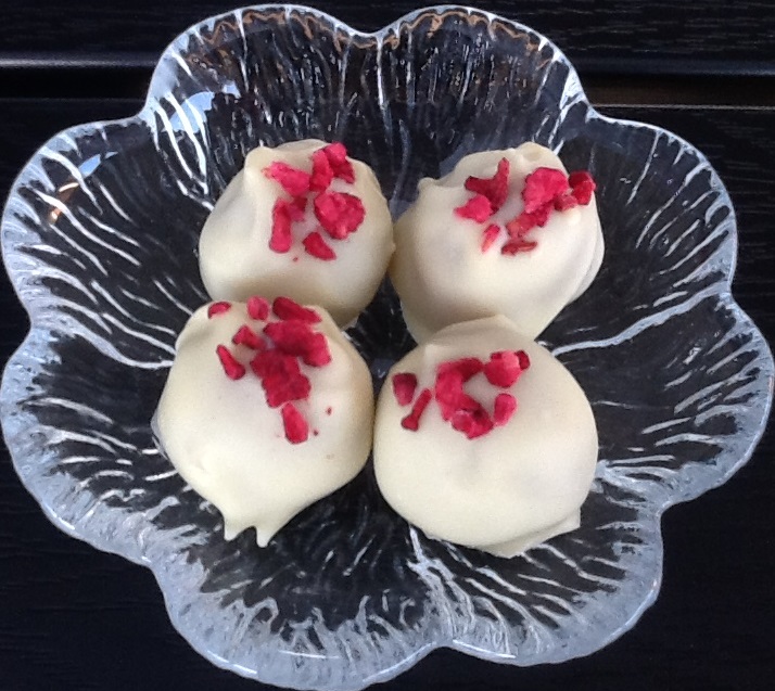 Vend marcipankuglerne i den smeltede chokolade og sæt dem på bagepapir. Pynt med lidt frysetørrede hindbær. Stil kuglerne i køleskabet til næste dag, for at smagen kan udvikle sig.