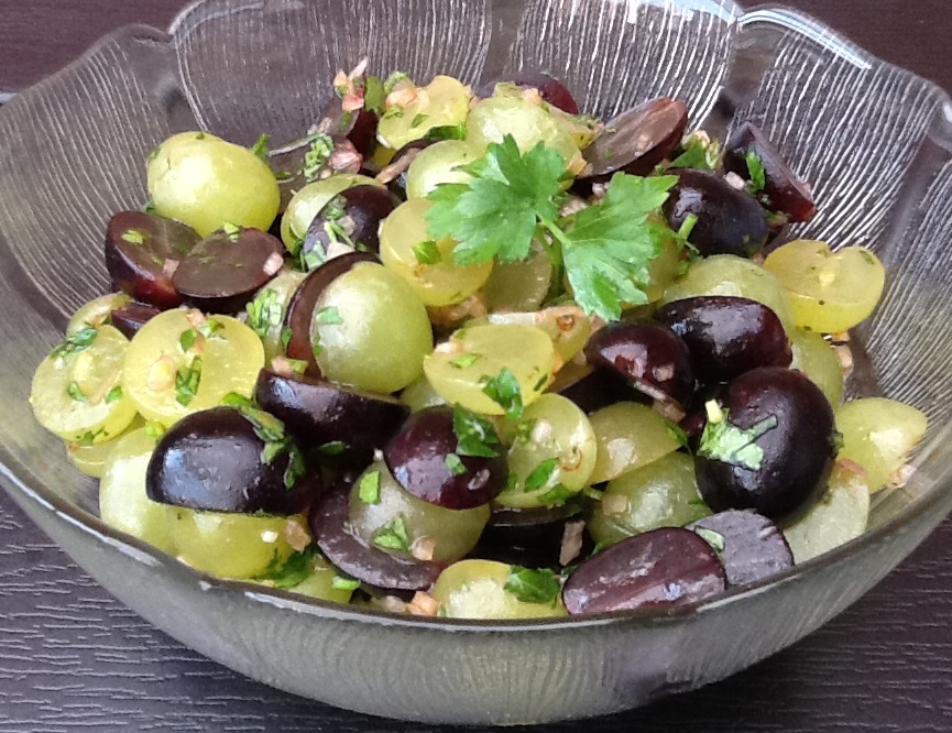 Halver druerne. Hak løg og persille fint. Rør balsamico, olie, salt og peber sammen. Kom druer, løg og persille op i dressingen og vend rundt. Stil salsaen i køleskabet. Server iskold.