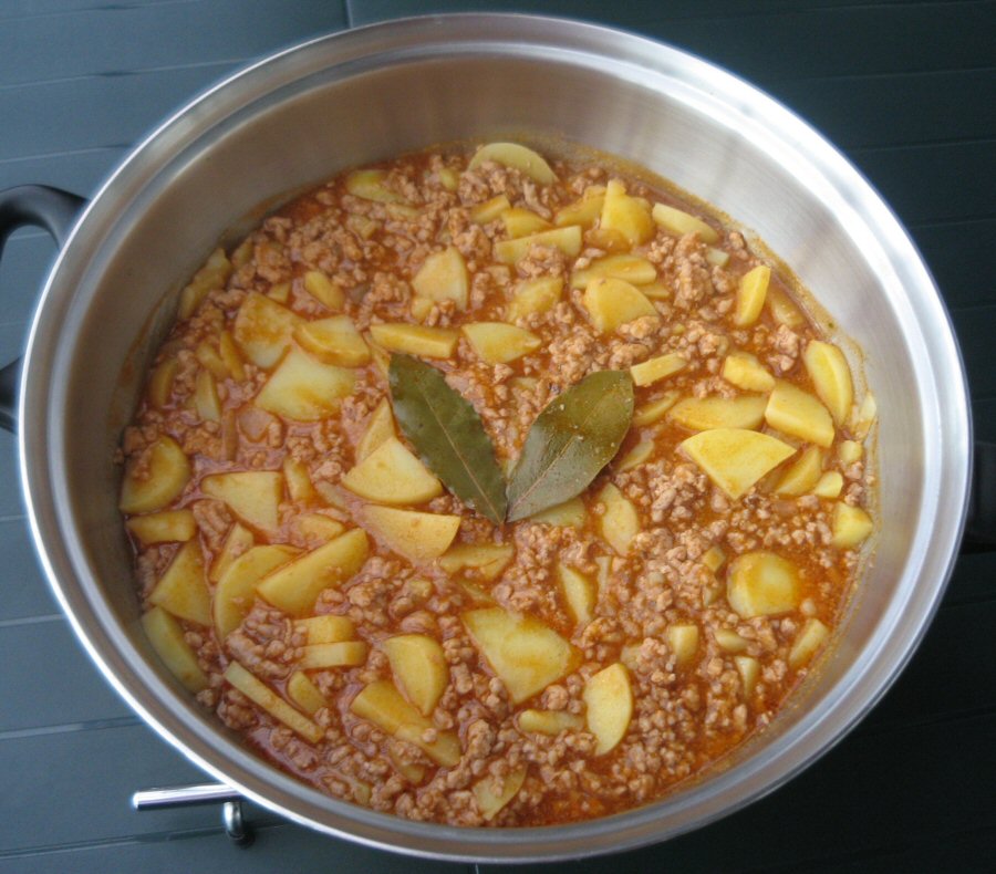 Brun fars og løg i lidt fedtstof i en dyb pande eller gryde. Rør ketchup, salt og peber i. Tilsæt vand og kom bouillonterningen i. De skrællede kartofler skæres i skiver og kommes i. Stik laurbærbladene ned i retten. Koger ca. 20 minutter indtil kartoflerne er møre. Jævnes med sovsejævner.