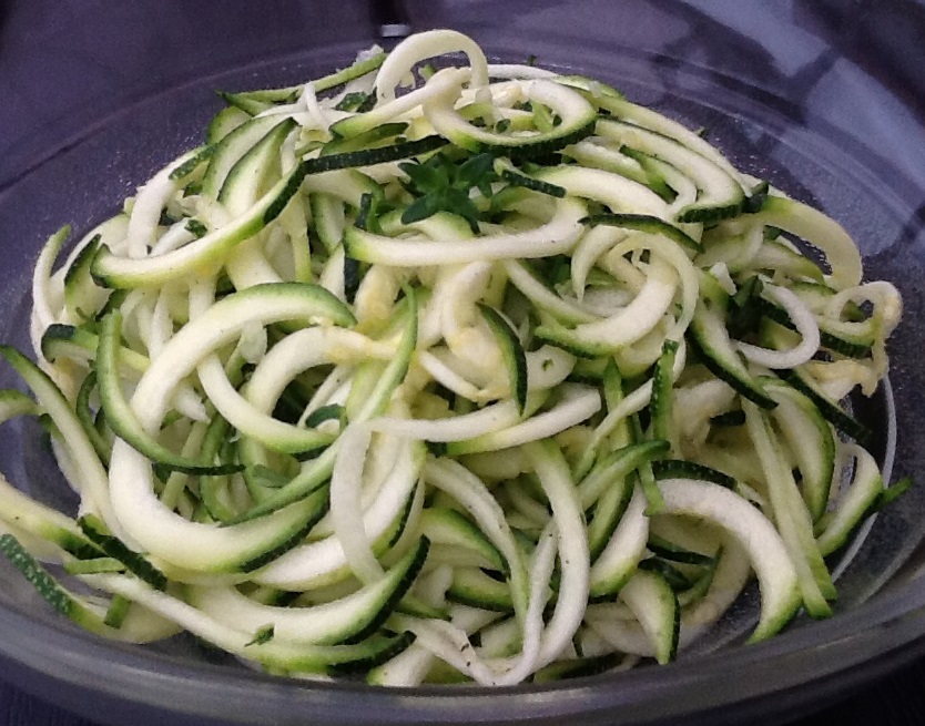 Skyl squashene og riv dem i lange strimler på en spiralizer. Drys med timian, et lille nip salt og lidt peber. Server med kødsovs eller lign.