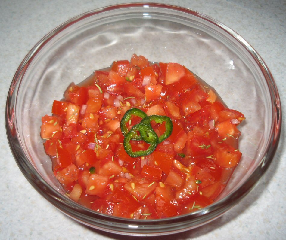 Tomaterne skæres i tern, rødløg hakkes fint, hvidløg knuses og chili hakkes fint. Blandes i en skål og limesaft, rosmarin, salt og peber tilsættes. Trækker evt. 10 min.