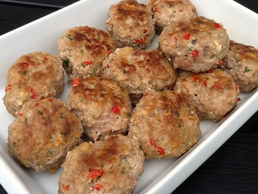 Skær snackpeber og løg i små fine tern. Hak persillen fint. Rør farsen med havregryn og æg. Smuldr feta i og rør snackpeber, løg, persille, oregano, salt og peber i farsen. Form farsen til små frikadeller og steg dem på panden i lidt fedtstof.