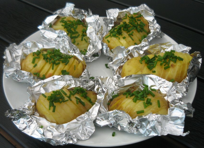 Kartoflerne skrabes. Hver kartoffel skæres i skiver, som lægges på et stykke folio. Drys med salt. Hæld lidt flydende margarine på kartoflen. Luk folien om kartoflen. Bages i ovnen ved 200 grader i ca. 35 min. Drys med fintklippet purløg inden servering.