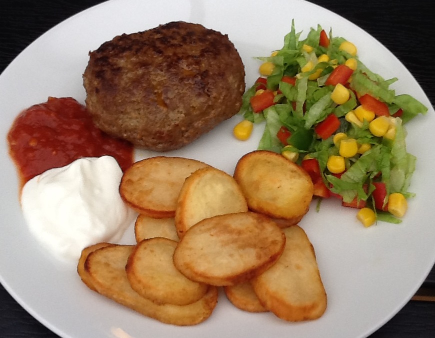 Rør farsen med taco krydderier, æg og piskefløde. Farsen formes til 4 bøffer, som steges i lidt olie på panden. Server bøfferne med taco sauce, creme fraiche, skivekartofler og salat.