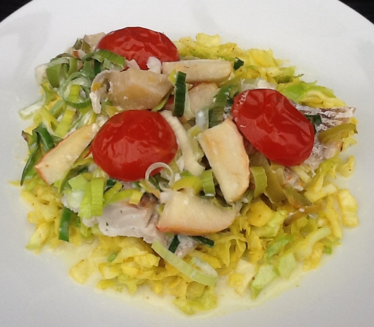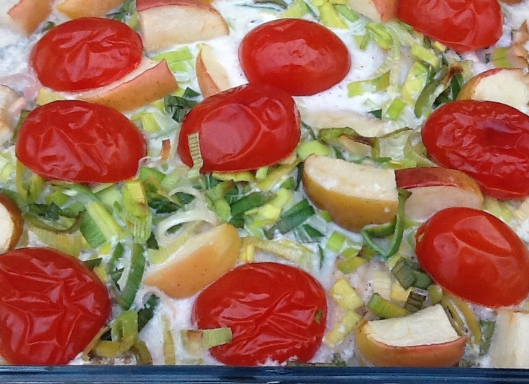 Skær torsken i passende stykker og læg dem i et ildfast fad ca. 20 x 20 cm. Krydr godt med salt og peber. Porre, tomater og æble skæres i mindre stykker og lægges hen over. Pres citronsaft over og kom fløden på. Bages i ovnen ved 200 grader i 25-30 minutter.