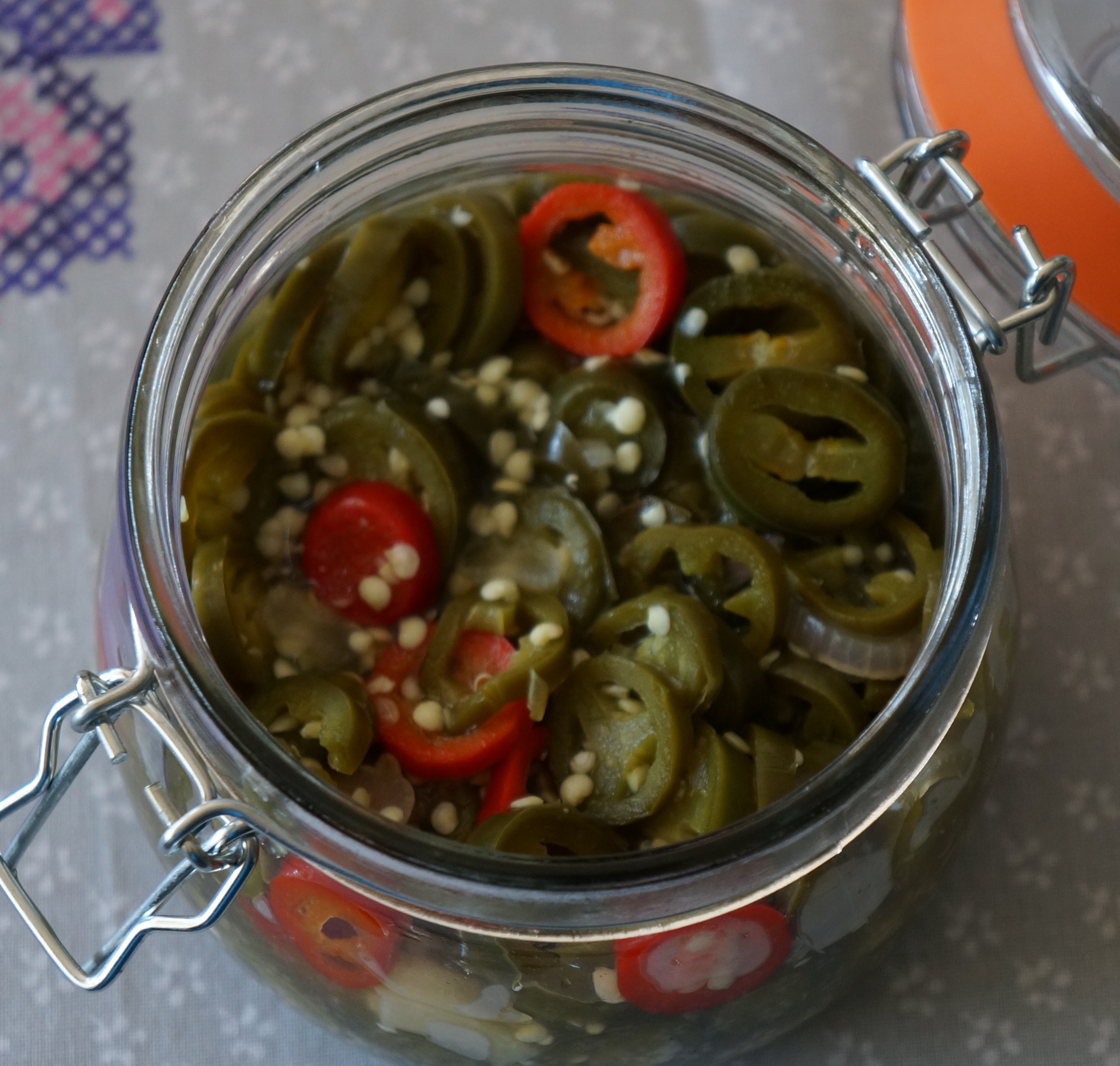 Fyld nu først jalapeños i et glas og hæld herefter lagen over indtil alle jalapeños er dækket.