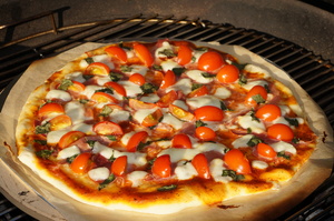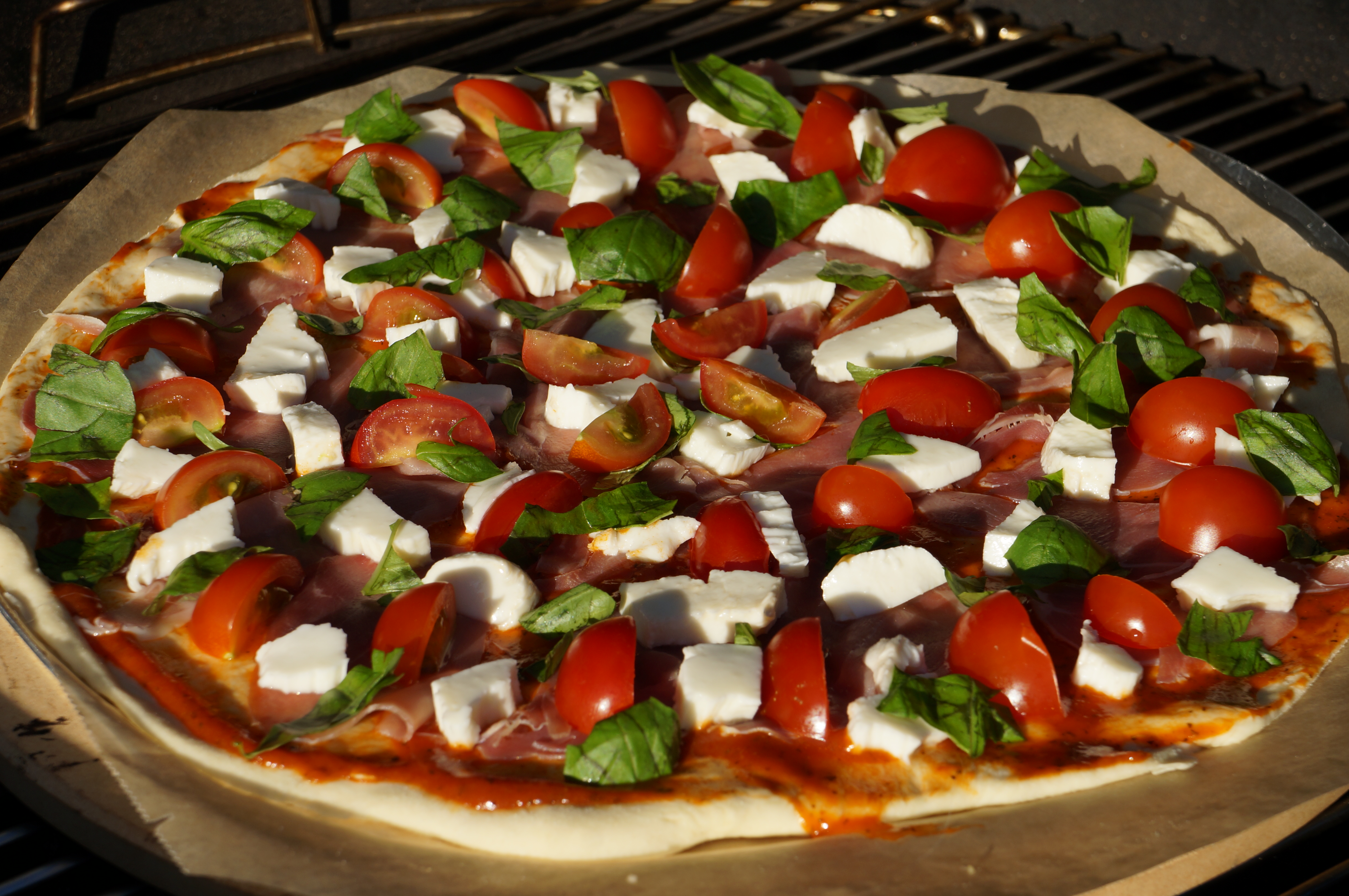 Fordel parmaskinke, tomater og mozzarella på pizzaen.