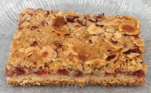 Bland hvedemel, sukker og bagepulver i en skål og smuldr smørret heri. Tilsæt ægget og saml dejen. Tryk dejen ud i en bradepande på ca. 20 x 30 cm beklædt med bagepapir. Fordel syltetøjet på dejen. Smuldr alle ingredienserne til crumblen sammen og fordel det over syltetøjet. Drys med hasselnøddeflager eller mandelsplitter. Bag kagen i ca. 25 minutter ved 200 grader til overfladen er gylden. Afkøl kagen og skær den i snitter.