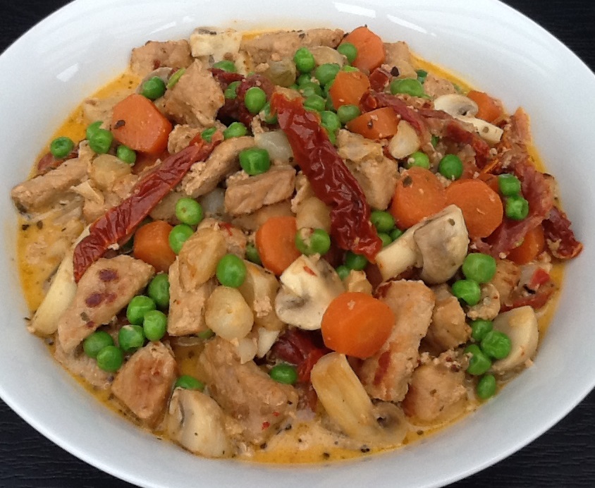 Skræl gulerødderne og skær dem i skiver. Klip de soltørrede tomater i strimler. Brun kødet i fedtstof i en gryde. Lad løgene svitse med. Tilsæt gulerødderne og svits dem kort. Kom tomatstrimlerne i gryden. Krydr med salvie, salt og peber. Tilsæt bouillon/vand og madlavningsfløde. Lad retten simre under låg i 30-40 minutter. Rens champignonerne og skær dem i halve eller kvarte. Svits champignonerne i lidt fedtstof på panden. Bland champignon og ærter i retten de sidste 5 minutter af stegetiden. Server retten med ris, pasta, kartofler eller kartoffelmos.