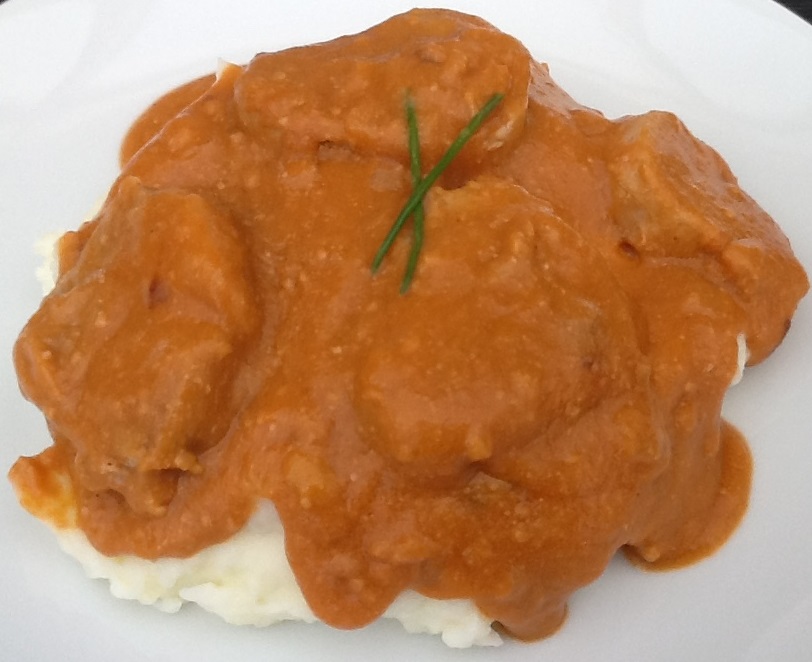Brun kødet i olie i en gryde. Tilsæt løgternene og lad dem svitse med. Kom tomatpureen i og svits et par minutter. Tilsæt peanutbuttervandet og det kogende vand. Krydr med cayennepeber, røget paprika, salt og peber. Kom laurbærbladene i og lad retten simre i 1 - 1 1/2 time. Jævn evt. med brun sovsejævner. Server retten med kartoffelmos eller løse ris.