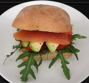 Flæk ciabattabollen. Kom rucola på underbollen og læg tomatskiver ovenpå. Dryp avocadoskiverne med citronsaft og læg dem på. Kom lakseskiven på og kværn lidt sort peber over. Læg toppen af bollen på.
